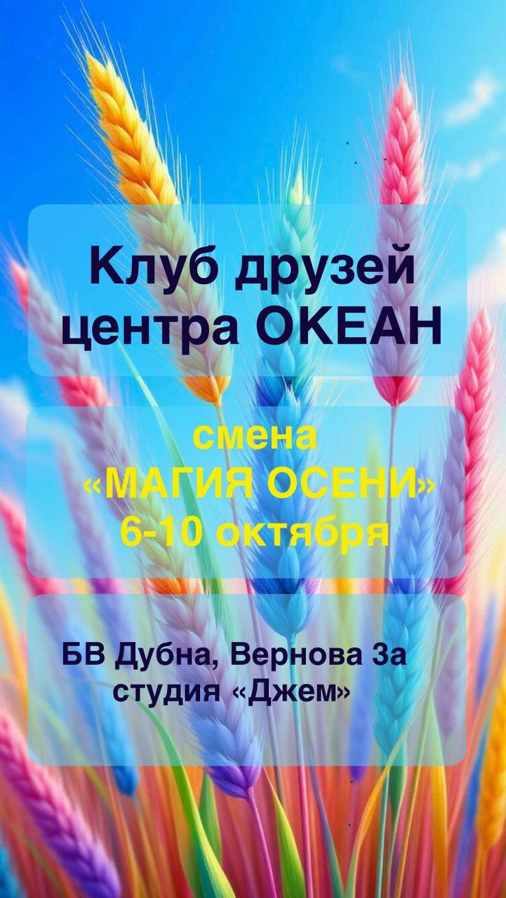 Действительно КРУТЫЕ КАНИКУЛЫ 6-10 ОКТЯБРЯ смена «МАГИЯ ОСЕНИ» ждут наших ребят в Клубе друзей центра ОКЕАН 🌟❤️🌊 Адрес: Дубна, БВ, Вернова 3а, лофт-студия «Джем».
